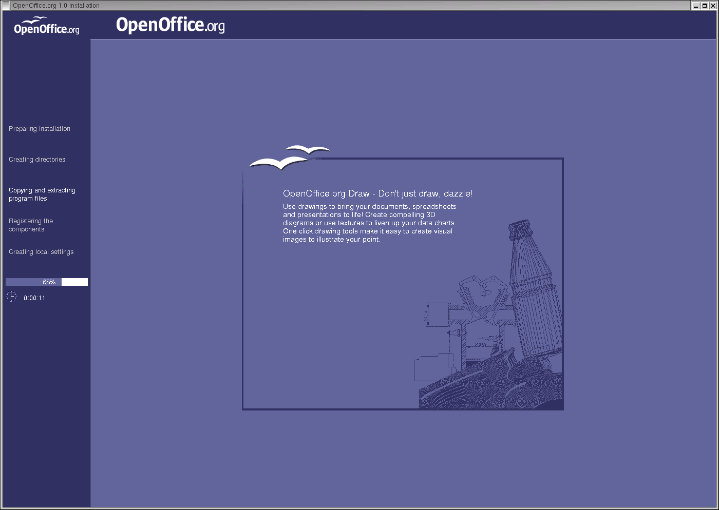OpenOffice -t ei saa osta, vaid teda tuleb oma arvutisse tõmmata internetist aadressilt - http://www.openoffice.org. Hiljuti ilmus OpenOffice versioon 1.0. Instaleerimiseks tuleks oma arvutisse tõmmata fail OOo_1.0.0-LinuxIntel_install.tar.gz ja see lahti pakkida käsuga: tar xvzf OOo_1.0.0-LinuxIntel_install.tar.gz. Tekib alamkataloog install kus asub programm setup. OpenOfficet on võimalik installeerida ka tervikuna ühe kasutaja kodukataloogi, kuid mõistlikum on installeerida ta eraldi ja hoida vaid konfiguratsiooni- ja andmefailid kasutaja kodukataloogis. Selleks starditakse installatsiooniprogramm kasutajatunnuse root alt parameetriga /net.